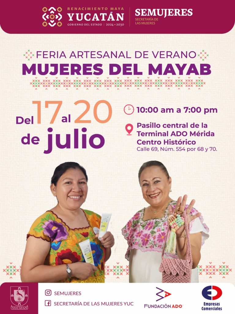 Del 17 al 20 de julio, 48 mujeres artesanas de diversos municipios de Yucatán, así como de Tabasco y Chiapas, participarán en la Feria Artesanal de Verano “Mujeres del Mayab”, organizada por el Gobierno del Estado, a través de la Secretaría de las Mujeres (Semujeres), en colaboración con la Fundación ADO.