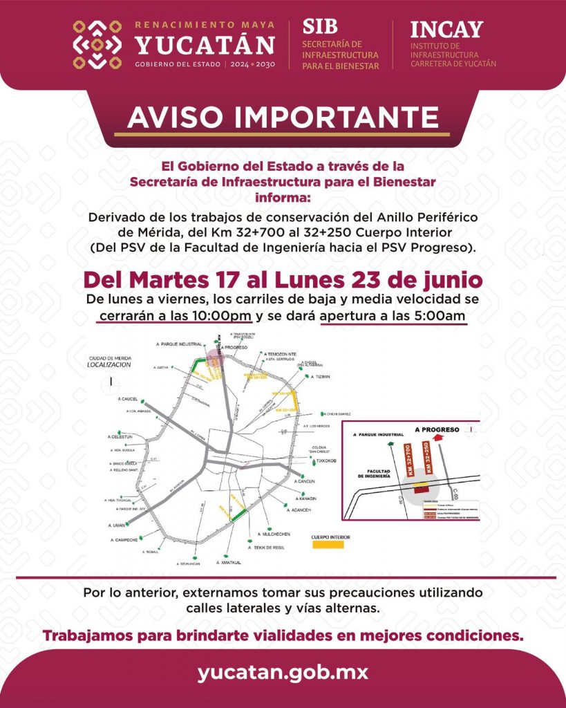 Asimismo, da a conocer que, como parte del programa de conservación del Anillo Periférico de Mérida, se continuará con la intervención en el cuerpo interior en el tramo comprendido del kilómetro 32+700 al 32+250, en sentido de la Facultad de Ingeniería hacia el PSV Progreso.