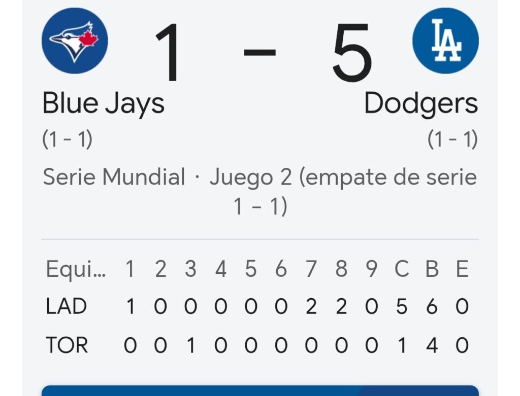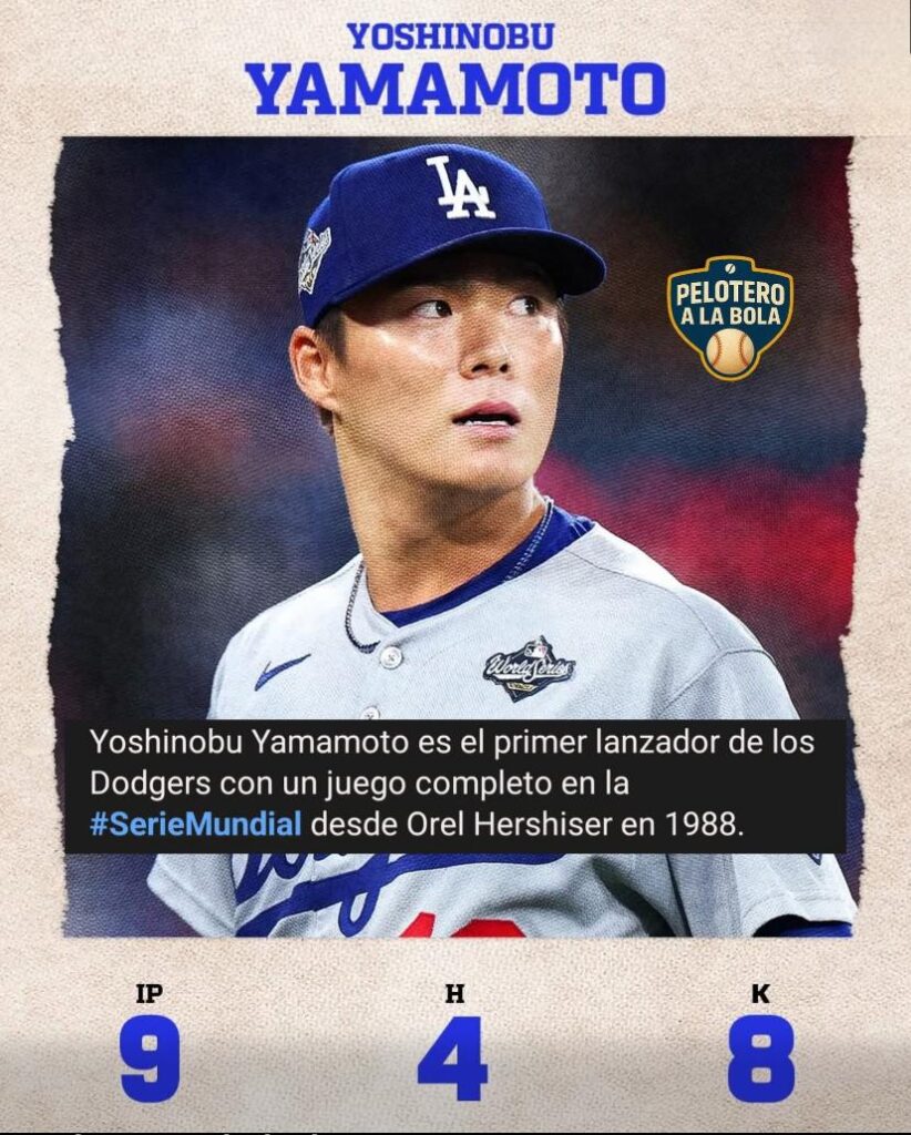 Los Dodgers empatan 1-1 la Serie Mundial al vencer a los Azulejos con magistral pitcheo del nipón Yoshinobu Yamamoto, quien tuvo un titubeante inicio pero recompuso el camino y tiró juego completo, su segundo al hilo en postemporada, tras duelazo de lanzadores con Kevin Gausman. Decisivos bambinazos de Will Smith y Max Muncy. Desde 2001, cuando Curt Schilling, de Cascabeles de Arizona, lanzó 3 juegos completos en postemporada, no ocurría esto.