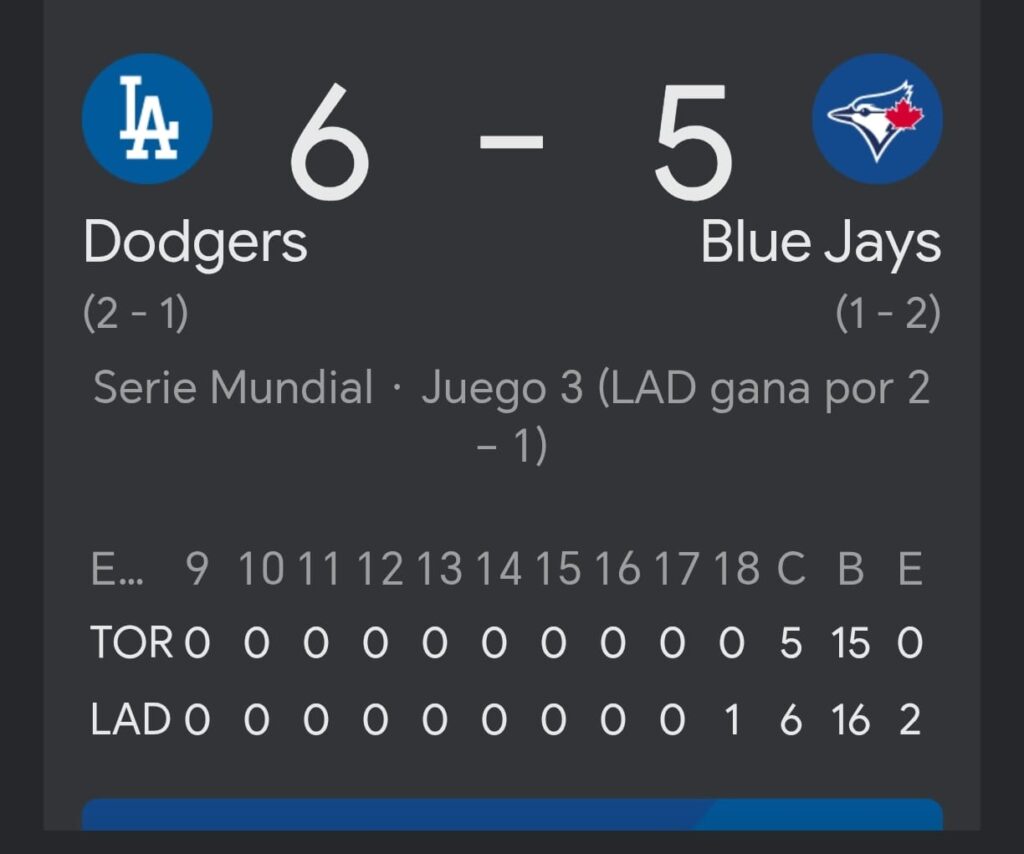 En partidazo de 18 entradas, que igualó el récord del juego más largo en Serie Mundial, los Dodgers vencieron a los Azulejos, 6×5, con decisivo jonrón de Freddie Freeman para tomar ventaja de 2-1. Tremenda actuación de Shohei Ohtani con 2 bambinazos, 2 dobles y 5 pasaportes. También la desforró Teóscar Hernández por Dodgers y Alejandro Kirk, por Toronto, con 2 en base. Cada manager utilizó a casi una decena de lanzadores. El anterior partido de 18 episodios fue en 2018 entre los mismos Dodgers que ganaron a Medias Rojas con bambinazo de Max Muncy.