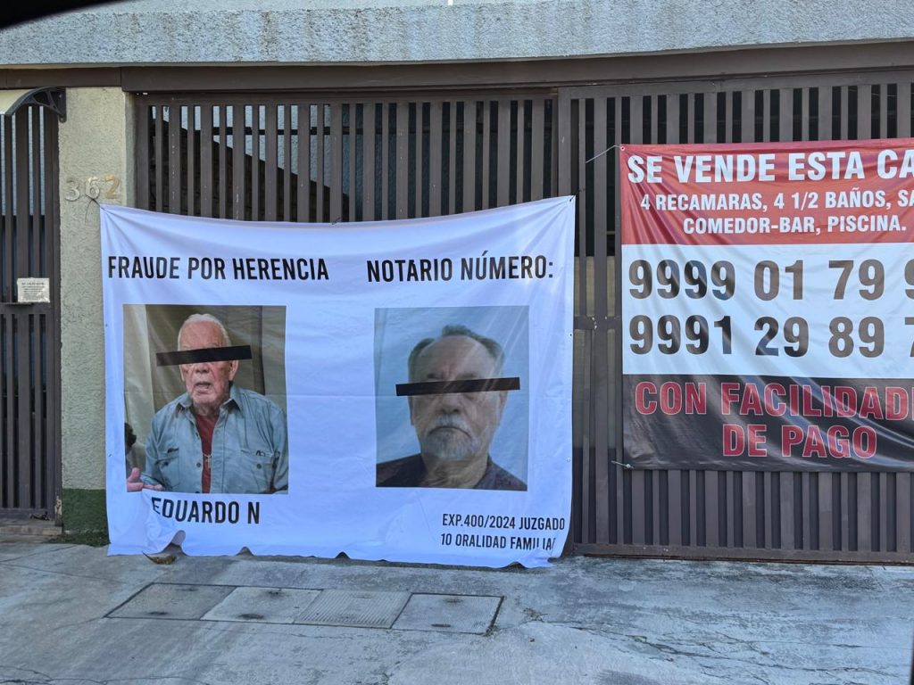 Con una imagen impresa en lona bastante llamativa exhiben lo que parece ser un caso más de fraude, con los rostros protegidos del personaje que nombran “Eduardo N” y de quien sería su notario, se da cuenta de un caso más de: fraude por herencia.
