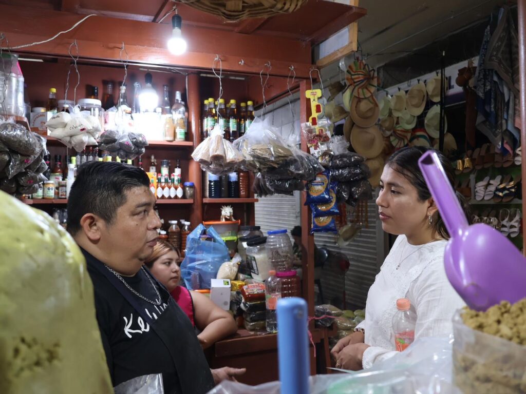 Posteriormente, acompañada de Marlene Uc Cocom, presidenta de esta agrupación y Carlos Koyoc Uribe, presidente de la Unión de Locatarios del Mercado San Benito, caminó por los pasillos de los emblemáticos mercados del Centro Histórico para dialogar con los comerciantes.