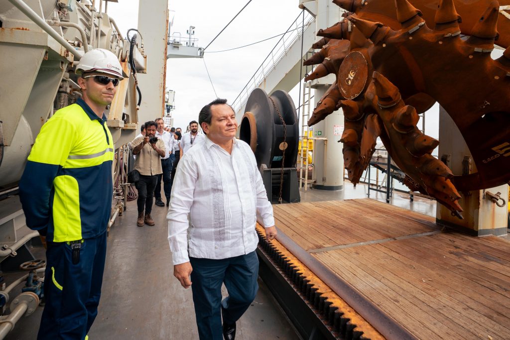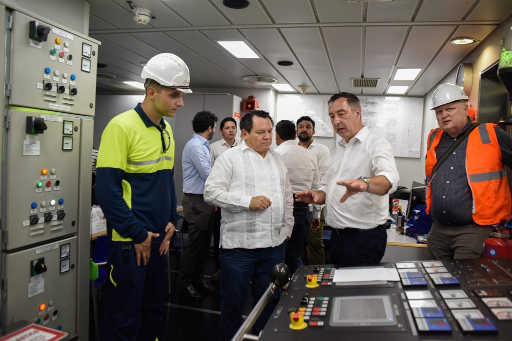 También observó el funcionamiento de las cortadoras que remueven roca del fondo marino, los talleres de mantenimiento, el cuarto de bombeo con sus potentes sistemas de traslado de material y el centro de control, desde donde se operan los tres motores principales que en conjunto alcanzan una potencia de 23,000 kilovatios.