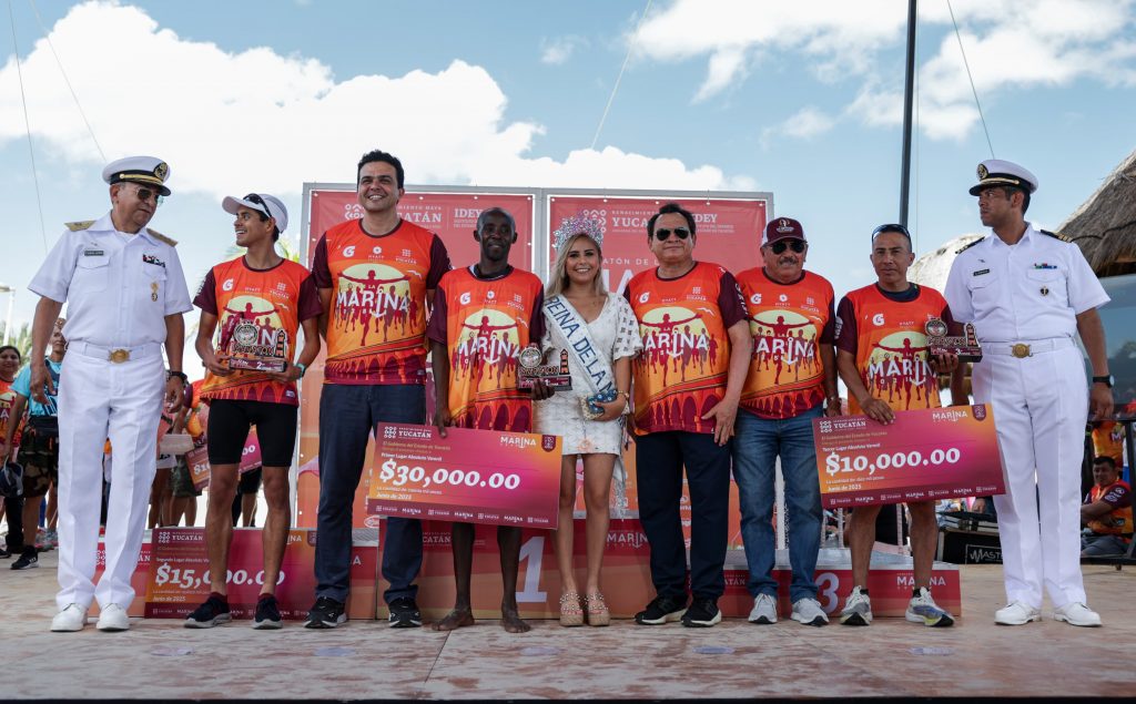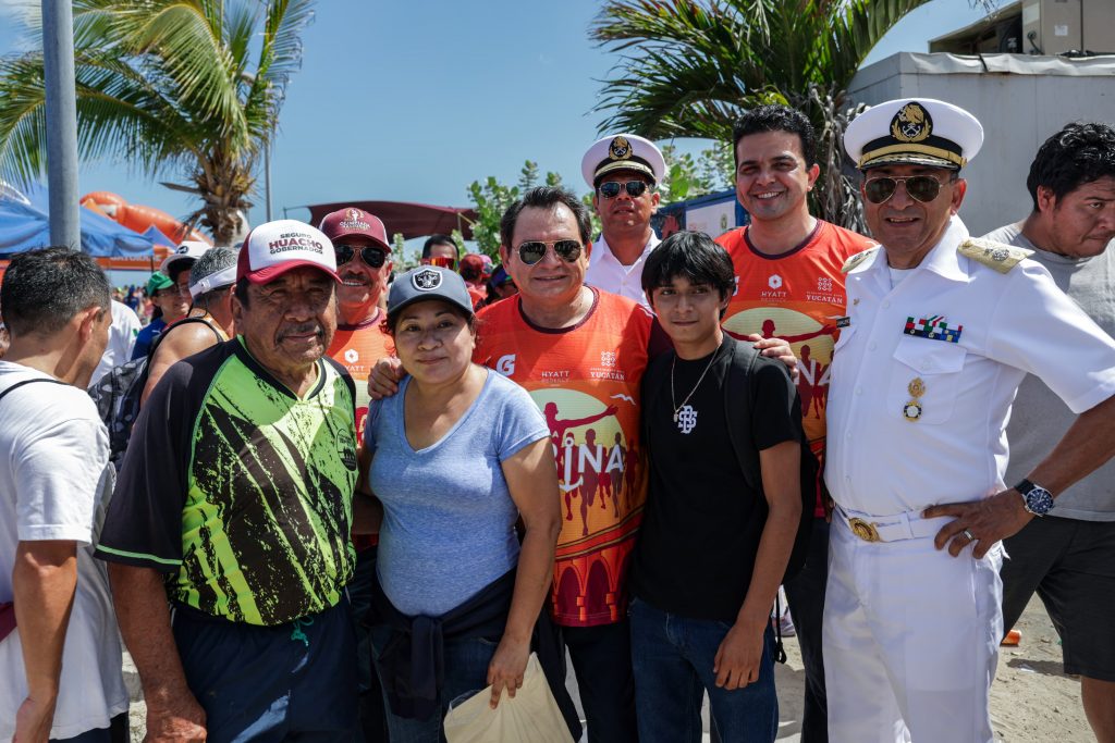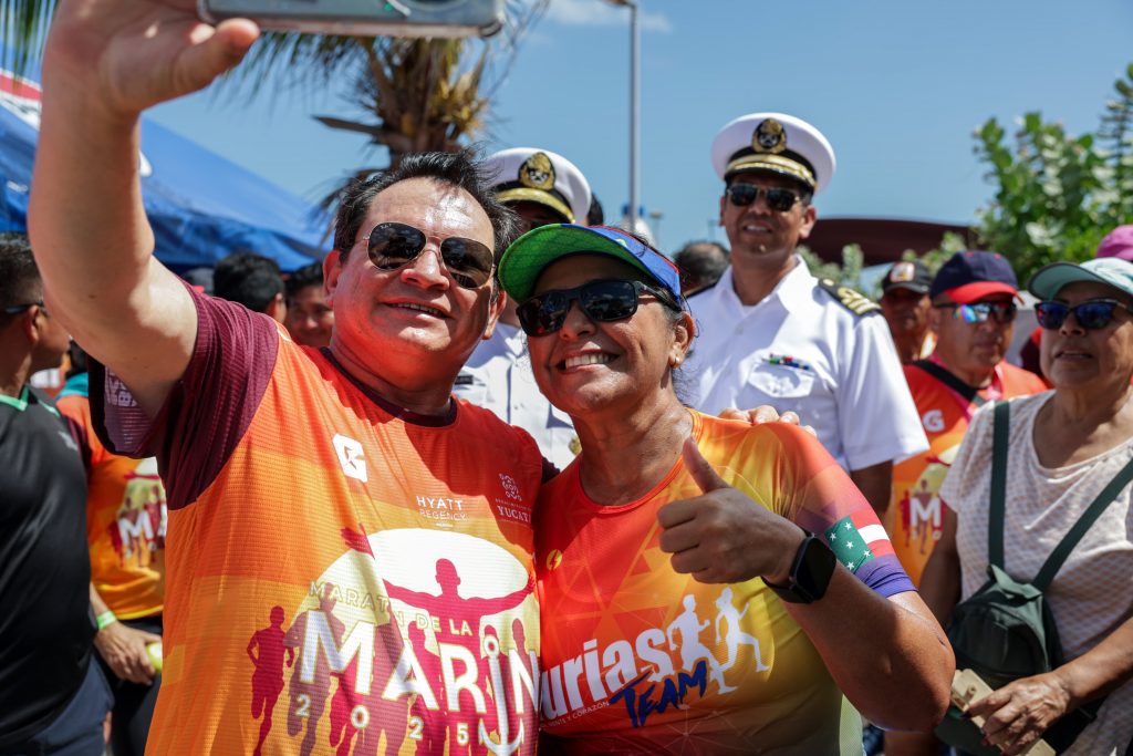 Acompañaron al mandatario en esta jornada deportiva el alcalde de Progreso, Erik Rihani González; el Capitán de Fragata Cuerpo General Noé Aldebarán Cruz Magaña, representante de la Novena Zona Naval; el Contralmirante Cuerpo General Diplomado de Estado Mayor Armando Caballero Vázquez, Capitán de Puerto Regional de Progreso; Fiona Almeida Figueroa, reina de la Marina Progreso 2025; y Raúl Fernando Díaz Martín, pionero del Maratón de la Marina.