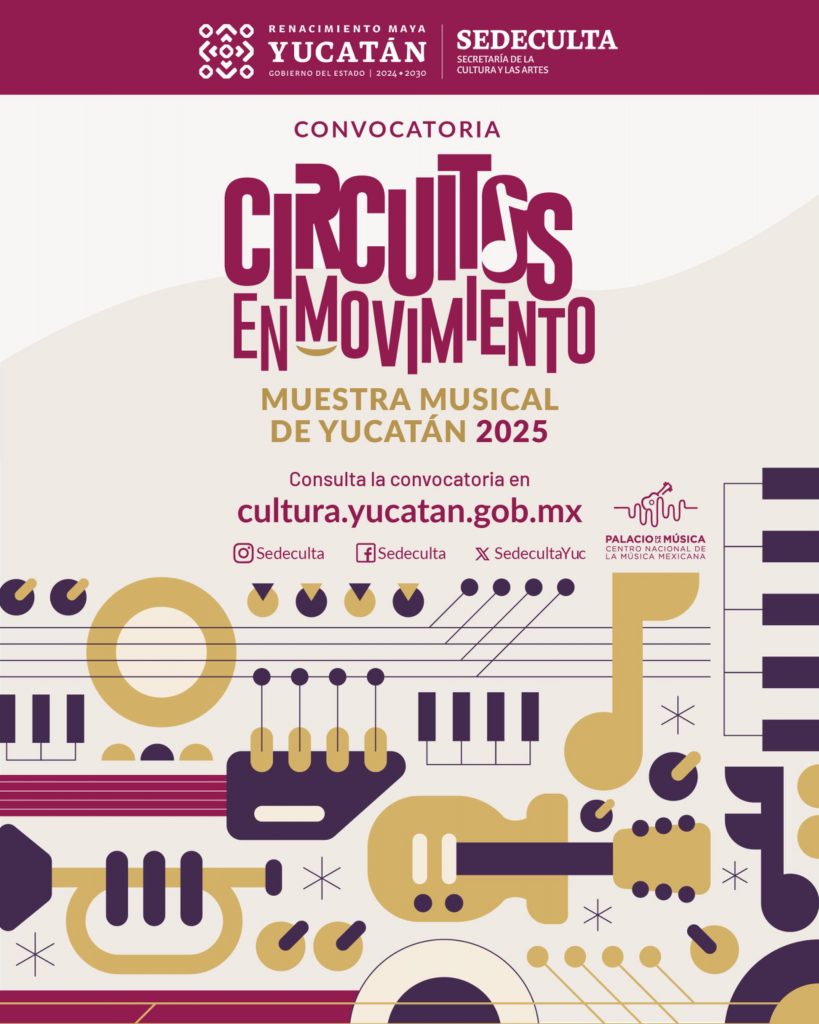La Secretaría de la Cultura y las Artes (Sedeculta) invita a agrupaciones y solistas musicales emergentes del estado a participar en la convocatoria Circuitos en Movimiento: Muestra Musical de Yucatán 2025, que tiene como objetivo impulsar su profesionalización y promover sus propuestas fuera de la entidad.