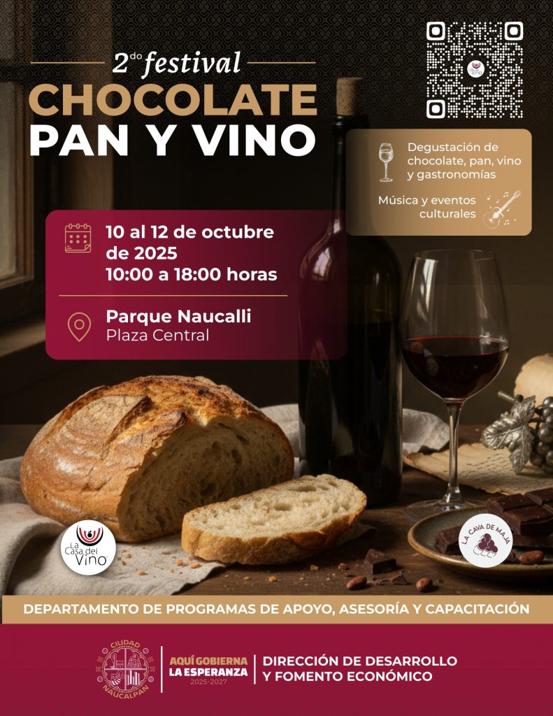 El Festival Chocolate, Pan y Vino regresa con su segunda edición llena de sabores, aromas y experiencias únicas. Con el propósito de promover la cultura y el consumo de la rica variedad de chocolates, panes, vinos y repostería, se llevará a cabo los días 10, 11 y 12 de octubre de 2025, en la Plaza Central del Parque Naucalli, en el Municipio de Naucalpan de Juárez.